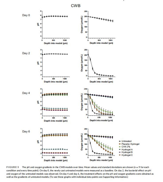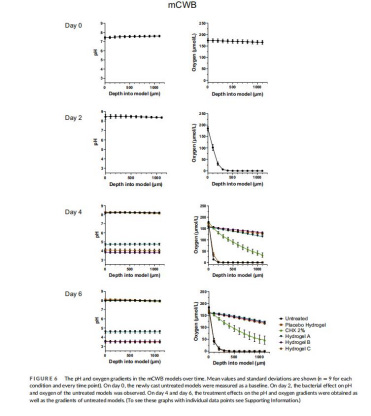 圖4顯示未處理模型pH升至>8.0(mCWB更持久),氧氣通量率升高至~13.6 nmol O?cm?2min?1(表示細(xì)菌呼吸導(dǎo)致缺氧)。圖5-6中,水凝膠將pH降至3.1–4.6(例如Hydrogel B pH=3.1),氧氣梯度恢復(fù)至基線(滲透深度>1 mm),洗必泰僅輕微改善pH(~7.3)和氧氣梯度。意義在于:高pH和缺氧是慢性傷口非愈合的關(guān)鍵標(biāo)志,水凝膠通過(guò)酸化逆轉(zhuǎn)微環(huán)境,支持組織修復(fù)(低pH促血管生成和免疫反應(yīng)),而氧氣恢復(fù)表明代謝負(fù)擔(dān)減輕。