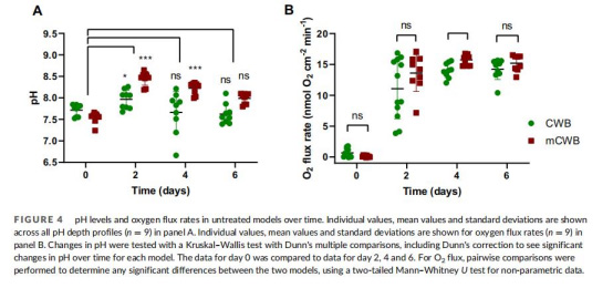 研究采用分層改進(jìn)策略。首先,優(yōu)化原始慢性傷口生物膜模型(CWB):將瓊脂基質(zhì)替換為膠原(2 mg/mL),添加生理鹽水緩沖液(PBS),并在Transwell插入裝置中構(gòu)建兩層結(jié)構(gòu)——真皮層(含血清、血液、膠原)和脂肪層(含豬脂肪、膠原)。雙菌種接種:銅綠假單胞菌加入下層,金黃色葡萄球菌加入上層,初始菌量為100-200 CFU。模型置于傷口模擬培養(yǎng)基中,每24小時(shí)更換培養(yǎng)基以模擬營(yíng)養(yǎng)動(dòng)態(tài)輸入。其次,測(cè)試抗菌產(chǎn)品:水凝膠(pH 2.2–2.5)和洗必泰(pH 5.9)單次或重復(fù)(2×2天)應(yīng)用于模型表面。評(píng)估包括菌落計(jì)數(shù)、pH/氧氣微梯度測(cè)量(使用丹麥Unisense微電極)和共聚焦顯微鏡成像。整個(gè)流程在6天內(nèi)完成,覆蓋基線、治療中和治療后階段。
