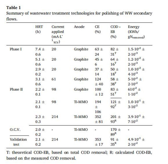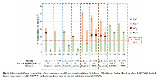 Phase II:處理高銨廢水(NH?-NO?-WW),更換陽(yáng)極材料測(cè)試消毒效果,并提高電流密度(最高214 mA·L?1)以處理高氮負(fù)荷。