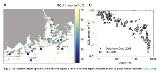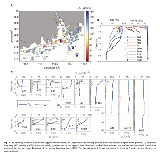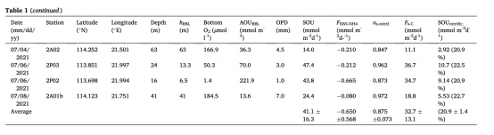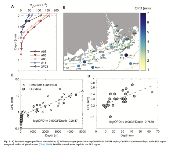 該研究針對珠江口(PRE)區(qū)域(水深10-70米)的沉積物耗氧(SOU)及其對缺氧的貢獻(xiàn)展開。研究發(fā)現(xiàn):
