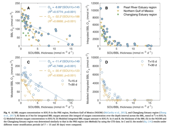 缺氧時(shí)間尺度:珠江口薄BBL(<10米)缺氧發(fā)展需<15天,厚BBL需<60天(圖6B)。