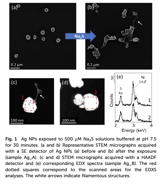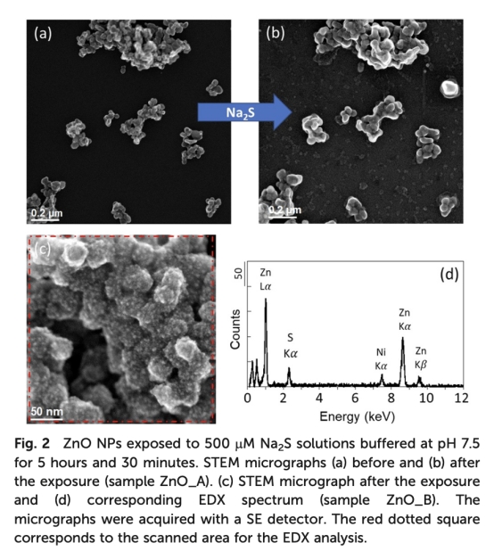 方法驗(yàn)證:在Na?S溶液中暴露TEM網(wǎng)格固定的Ag/ZnO NPs(圖1,2),通過(guò)STEM-EDXS觀察硫化進(jìn)程