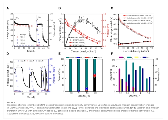 電化學性能數據:電壓輸出、極化曲線、功率密度(圖2A-F)。意義:量化DNMFC的產電穩定性(最大功率密度58.2 W/m3)及硝酸鹽對循環時間的縮短效應(含NO??時循環時間縮短50%)。來源圖2。