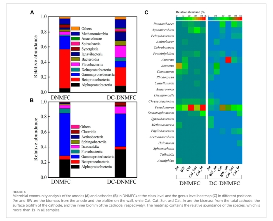 陽極生物膜:固氮弓菌屬(Azonexus,33.1%)主導(圖4C)。