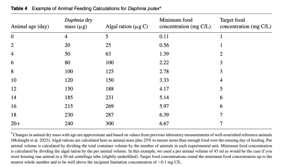 營養(yǎng)控制:計算藻類碳含量,按水蚤生物量提供過量食物(表4)。