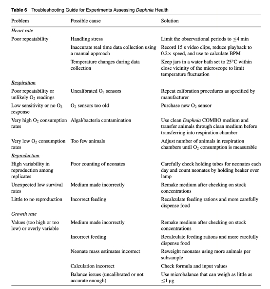 水蚤壽命和健康指標(biāo)對溫度、營養(yǎng)敏感,標(biāo)準(zhǔn)化操作是獲得可靠數(shù)據(jù)的前提(表5-6)。