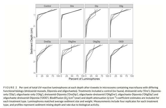 添加熒光示蹤顆粒(luminophores),6周后分層切片量化沉積物混合深度與速率。