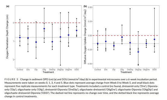 氧氣動(dòng)態(tài)(圖3):各組OPD平均10±3mm,隨時(shí)間略有增加(Diporeia組+1.5mm),但組間差異不顯著。意義:低溫(4℃)和低POM抑制了生物擾動(dòng)對(duì)耗氧的調(diào)控效應(yīng)。