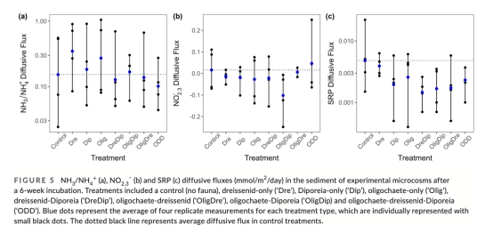 營(yíng)養(yǎng)通量(圖5):沉積物內(nèi)SRP擴(kuò)散通量均為負(fù)值(-0.003 mmol/m2/day),組間無(wú)差異。意義:低磷沉積物中生物擾動(dòng)未顯著改變磷埋藏效率。