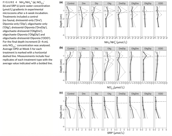 研究通過(guò)6周沉積物微宇宙實(shí)驗(yàn),對(duì)比入侵貽貝(斑馬貝/斑驢貝)、本地片腳類(Diporeia)和寡毛類在低有機(jī)質(zhì)沉積物中的生物擾動(dòng)效應(yīng)。發(fā)現(xiàn)入侵貽貝幾乎不擾動(dòng)沉積物(混合深度僅0.5cm),而Diporeia生物擾動(dòng)最強(qiáng)(混合深度達(dá)2.5cm)。但各組間沉積物氧氣滲透深度(OPD)、耗氧量及營(yíng)養(yǎng)鹽通量無(wú)顯著差異,表明在貧營(yíng)養(yǎng)湖區(qū),生物群落的更替可能主要通過(guò)直接生理效應(yīng)而非沉積物地球化學(xué)過(guò)程影響生態(tài)系統(tǒng)。