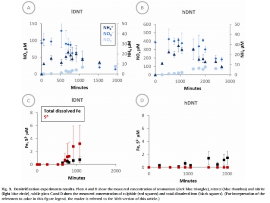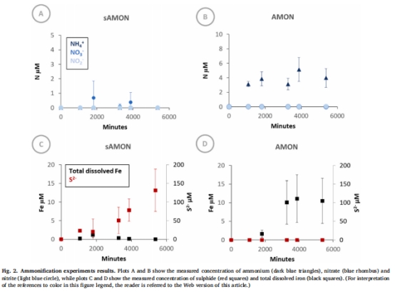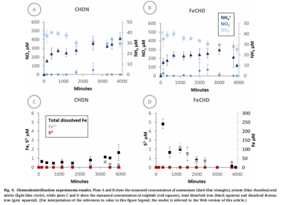數(shù)據(jù):∑S2?在表層沉積物實(shí)驗(yàn)(sAMON)中積累(130 μM),深層(AMON)無積累(圖2C,D);Fe2?在反硝化/CDNT實(shí)驗(yàn)中釋放(圖3C,D, 圖4C,D)。