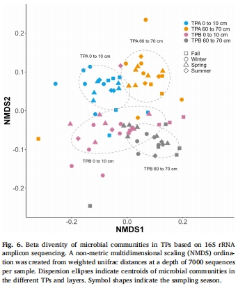 群落穩定性:活性微生物群落結構主要受泥炭地和深度影響,季節變化不顯著(圖6)。