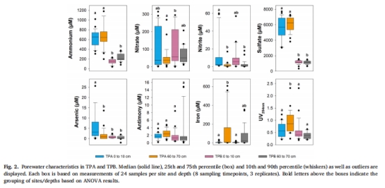 孔隙水:鐵在深層釋放顯著(圖2);砷/銻去除率全年穩定(TPA >90%,TPB ~50%),氮/硫酸鹽去除率夏季更高(圖4)。