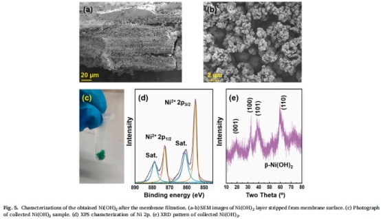 數據:SEM顯示Ni(OH)?為多孔納米片堆疊結構(圖5a-b),XRD證實β-Ni(OH)?相(圖5e),純度60.2%優于商業產品(57%)。
