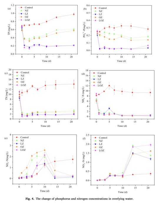 N和P濃度在上覆水中的變化(來自Fig. 4)。研究意義:追蹤TP、TN、PO4 3-P、NH4+-N、NO2-N和NO3-N濃度(如LOZ組TP減少80%),證實LOZ通過吸附和生物轉化減少營養鹽釋放,評估短期和長期控制效果(Fig. 4a-f顯示LOZ顯著降低P和N濃度)。