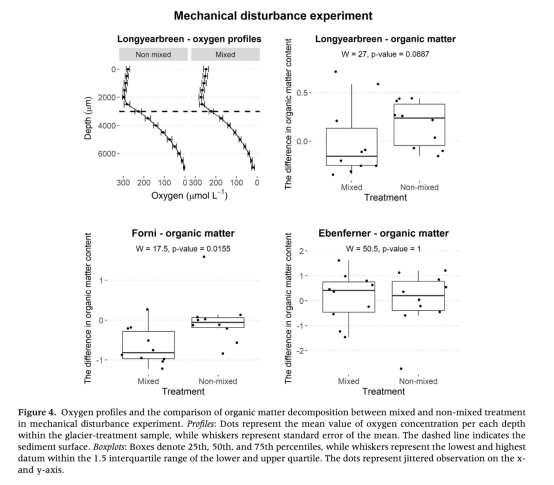機械混合對有機質(zhì)分解的影響因地而異(Forni冰川顯著降低,Longyearbreen趨勢類似但不顯著,Ebenferner無差異)。
