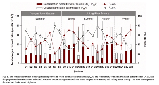 來源:圖4(反硝化、厭氧氨氧化速率及時(shí)空分布)、圖5(反硝化衍生的N2和N2O產(chǎn)率)、圖6(水柱NOx支持與沉積物硝化支持的氮去除貢獻(xiàn))