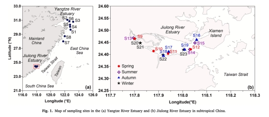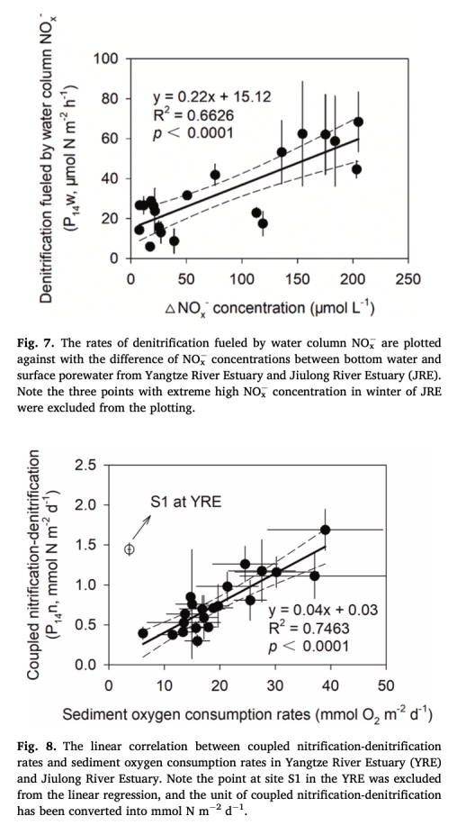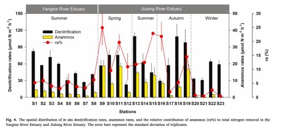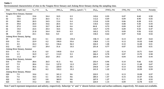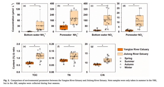 意義:揭示九龍江口富營養(yǎng)化程度更高(NOx和NH4濃度、TOC含量顯著高于長(zhǎng)江口),為氮去除速率空間差異提供背景依據(jù)。