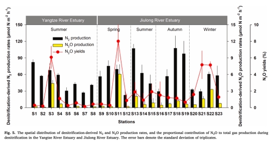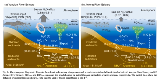 來源:圖5(N2O產(chǎn)率0.3-8.0%)、圖9(沉積物N2O對(duì)海氣通量的貢獻(xiàn))