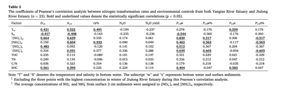 意義:證實(shí)反硝化是主導(dǎo)過程(長(zhǎng)江口51.6±19.6 μmol N m?2 h?1;九龍江口72.1±33.3 μmol N m?2 h?1),厭氧氨氧化貢獻(xiàn)僅8.6%;溫度、鹽度、NOx濃度和SOC是主要調(diào)控因子(表2)。