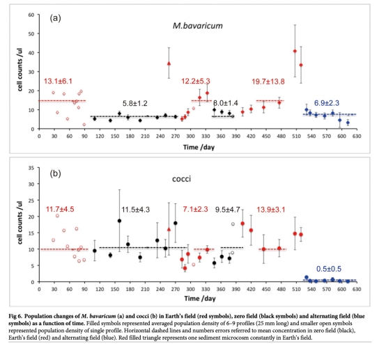 意義:直接量化趨磁優勢。零場中M. bavaricum下降50%證明趨磁是其生存關鍵;球菌在交變場中幾乎滅絕,支持極性趨磁機制理論。