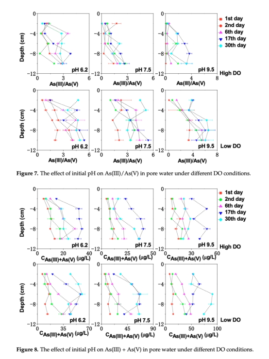 意義:低DO下孔隙水As(III)/As(V)比值達5.20(pH 9.5),表明厭氧還原促進高毒性As(III)生成;上覆水砷濃度升高至11.25 μg/L(圖9),量化釋放強度。