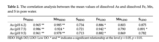 DO主導釋放:低DO環境砷釋放量顯著高于高DO(上覆水濃度高3.2倍),主因鐵錳氧化物還原溶解(Fe/Mn與As濃度顯著正相關,表2)。