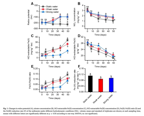 量化厭氧程度:直接證明動態水流顯著提高沉積物Eh(靜水組Eh=-224.6 mV →強水流組Eh=-93.1 mV),明確水流擾動通過氧氣輸入削弱沉積物還原性。