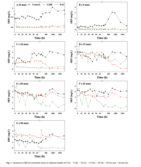 SRP(圖1):監(jiān)測孔隙水中磷濃度變化,評估鈍化劑對磷的即時(shí)與長期去除效果。意義:揭示PAC對深層SRP(-50 mm)的高效控制(100%去除率),但中層(-15 mm)因pH降低導(dǎo)致去除率最低(35%)。