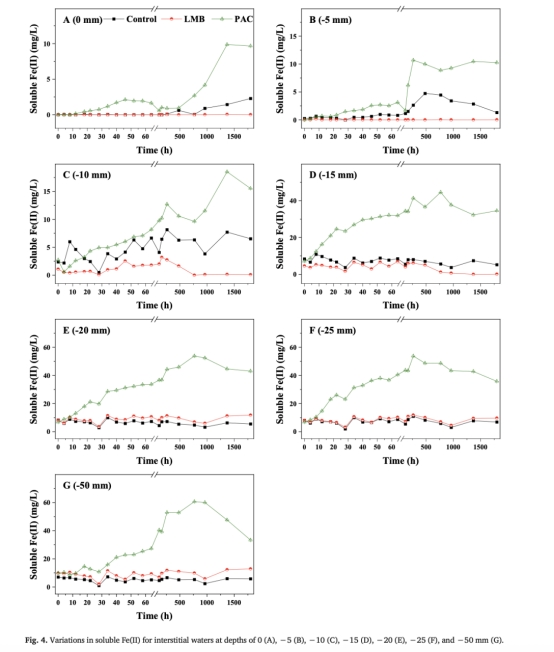 關(guān)鍵機(jī)制驗(yàn)證:證實(shí)PAC添加后全剖面pH下降(最低6.7),促進(jìn)H?競爭吸附位點(diǎn),導(dǎo)致結(jié)合態(tài)Fe(II)解吸(圖4)和鐵氧化物溶解,進(jìn)而釋放磷(圖2中層通量↑)。