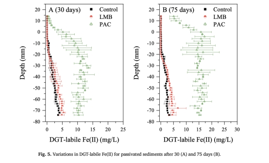 可溶性Fe(II)(圖4)與DGT活性Fe(圖5):同步監(jiān)測溶解態(tài)和活性鐵。意義:揭示PAC引發(fā)全剖面Fe(II)劇增(pH降低促進(jìn)解吸),直接驅(qū)動(dòng)磷釋放(圖2中層通量升高)。