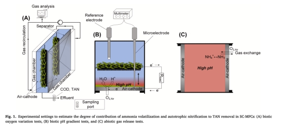 摘要指出:?jiǎn)问椅⑸锶剂想姵兀⊿C-MFCs)中總氨氮(TAN)的去除機(jī)制尚不明確,硝化-反硝化和氨揮發(fā)是主要報(bào)道的途徑。本研究通過(guò)數(shù)學(xué)建模量化電化學(xué)氨氣提(EAS)對(duì)TAN去除的貢獻(xiàn),結(jié)合三類(lèi)實(shí)驗(yàn)驗(yàn)證: