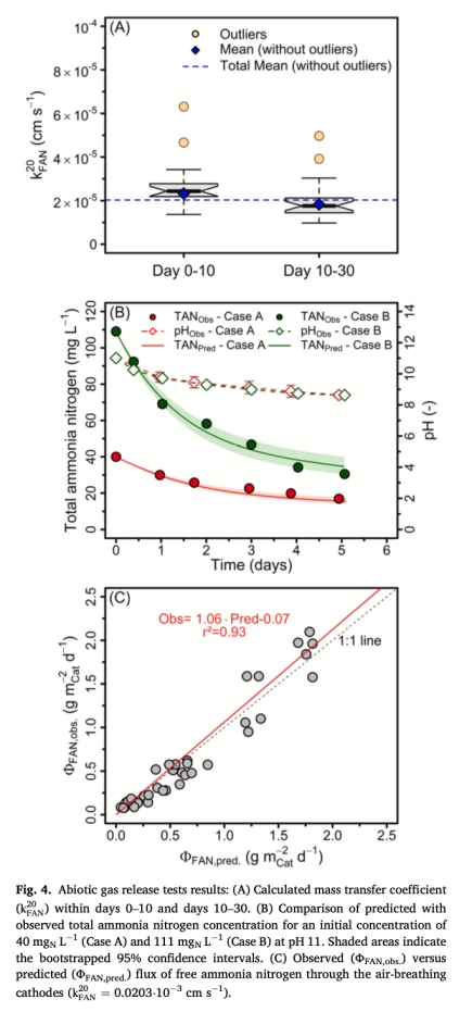 非生物氣體釋放測(cè)試(A-GR)量化氨揮發(fā)通量,結(jié)合模型預(yù)測(cè)閉路最大TAN去除率為785 mgN m?2 d?1(電流密度322 mA m?2)。
