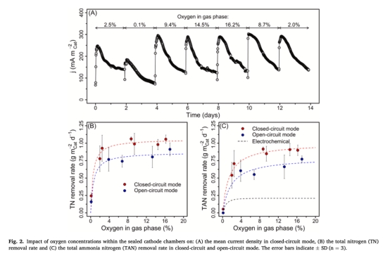 意義:氧濃度21%時(shí),閉路TAN去除率(730 mgN m?2 d?1)比開(kāi)路高29%,量化電化學(xué)貢獻(xiàn)(ηEAS=22%)。