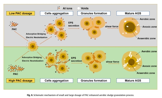 低劑量PAC:Al3?部分中和表面電荷,促進微生物聚集,形成致密大顆粒(圖8左)。