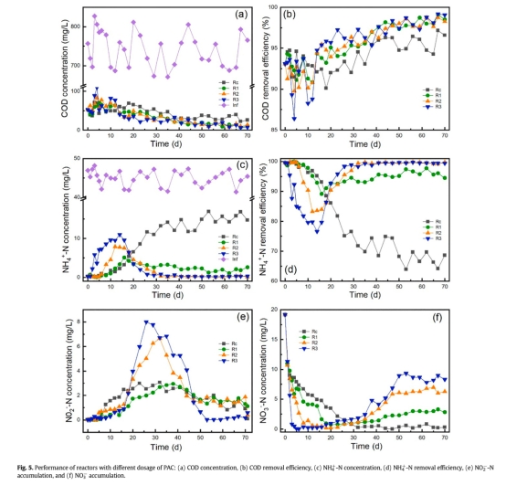 意義:驗證PAC提升脫氮效率(R3的NH??-N去除率99.38%),但高劑量導致NO??積累(9.34 mg/L)(第3.3節)。