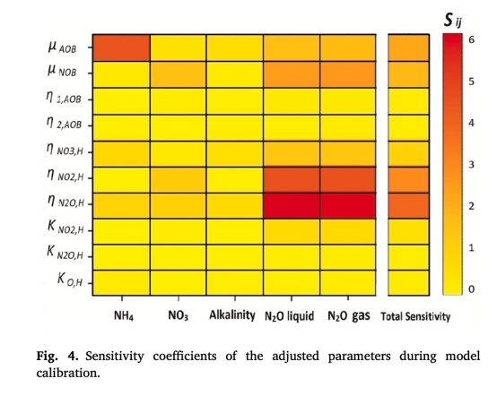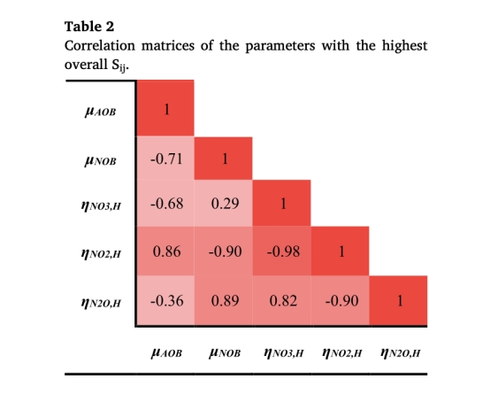 初步校準(zhǔn)(10參數(shù))→ 靈敏度分析(圖4)→ 相關(guān)性矩陣(表2)→ 最終校準(zhǔn)(4個(gè)關(guān)鍵參數(shù):ηN2O,H、ηNO2,H、μAOB、μN(yùn)OB)