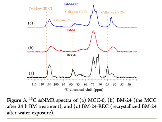 2. 水誘導重結晶驗證:將球磨后MCC暴露于水(40°C,30 min),通過XRD(圖2a)和固態NMR(圖3)檢測纖維素II型形成。