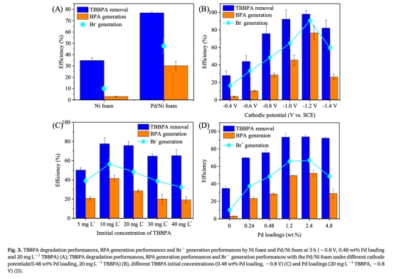 ? 數(shù)據(jù):-1.2 V陰極電位、10 mg L?1 TBBPA濃度下E??(脫溴率)達(dá)96.5%