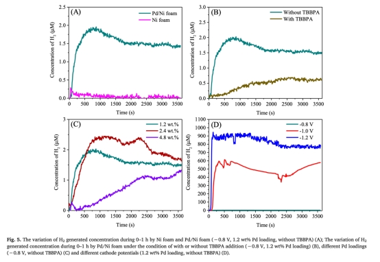 ? 數(shù)據(jù):-0.8 V時Pd/Ni foam的H?濃度(1.5 μM)為Ni foam(0.1 μM)的15倍;添加TBBPA后H?濃度下降0.6 μM