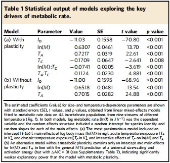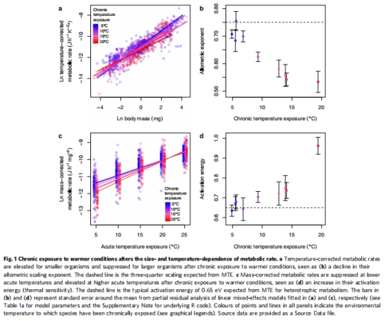 Fig.1a-b:慢性增溫降低代謝率的異速生長指數(bC=?0.0741,p<0.001),表明小體型生物代謝率提升更顯著(如5mg個體代謝率比MTE預測高40%,而500mg個體僅高5%)。