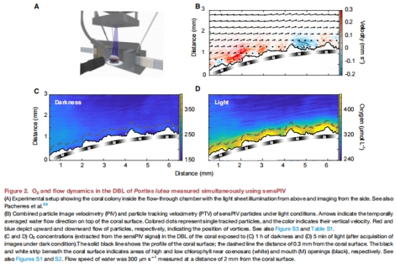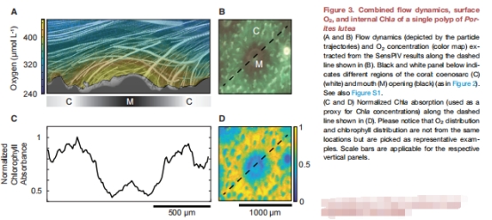 研究通過高光譜成像(圖1)和氧敏感粒子示蹤技術(sensPIV)(圖2)首次揭示珊瑚(Porites lutea)表面纖毛渦流對光合產氧的主動調控機制: