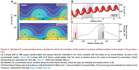纖毛渦流作用:形成尺度500μm的渦旋(圖2B),將共肉產生的氧氣橫向輸送至口部區域(圖3)