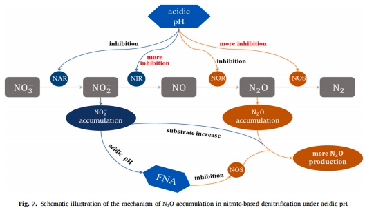 抑制機制:微電極分析表明,H?(氫離子)是N?O還原酶(NOS)的真實抑制劑,而非游離亞硝酸(FNA);同時低pH促進NOR活性,增加N?O生成。