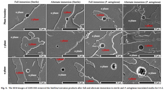 論文探究了銅綠假單胞菌(Pseudomonas aeruginosa)在完全浸沒(full immersion)與交替浸沒(alternate immersion)條件下對2205雙相不銹鋼(DSS)點蝕行為的差異影響。關鍵發現包括: