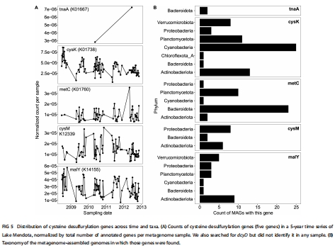 cysK、malY等基因廣泛分布于變形菌門、擬桿菌門等常見淡水類群(圖5B),證明該潛能在自然群落中普遍存在。