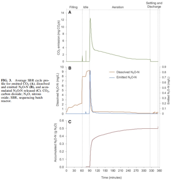 本研究通過中試規模序批式反應器(SBR-AGS) 處理真實生活污水,量化了 N?O與CO?排放特征: