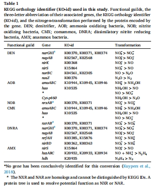 用KEGG/EnrichM預(yù)測氮轉(zhuǎn)化基因(amo, hao, nirK, nosZ等)(表1)。