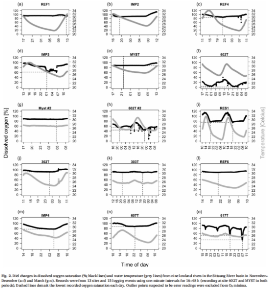 數(shù)據(jù):受干擾河段(如602T)夜間DO飽和度低至75%(vs. 原始河段>90%),日波動幅度達(dá)40%(圖2d)。