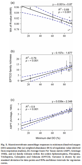 生態(tài)系統(tǒng)響應(yīng):污染河段的大型無脊椎動物群落氧調(diào)節(jié)能力(WAR)與最小DO飽和度顯著負(fù)相關(guān)(R2=0.69, p<0.001;圖5a),生物多樣性(EPTCO豐富度)和耐污指數(shù)(ASPT)同步下降(R2≥0.79;圖5b-c)。